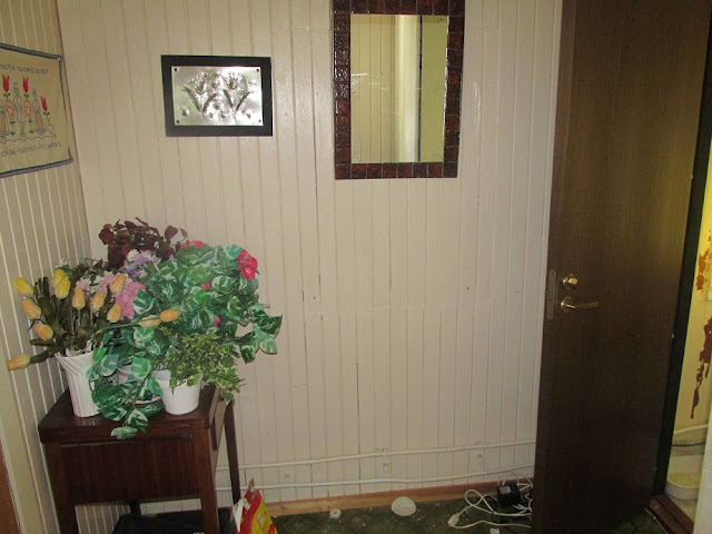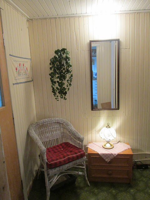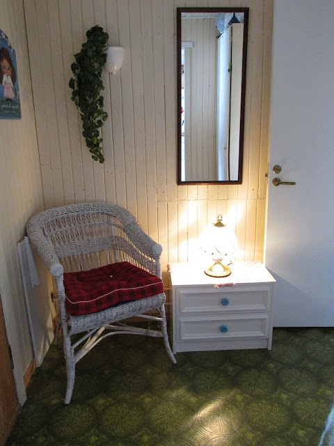Mellan toalettrum och duschrum finns denna lilla hall. Hallen har sett ut såhär ungefär i många år nu (på bilden saknas dock den lilla byrån) men när vi köpte stugan började vi med att möblera om och rensa lite.