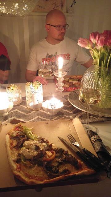 Ia hade gjort förrätt som vi först mumsade på, sen gjorde vi det enkelt och gott och beställde pizza.