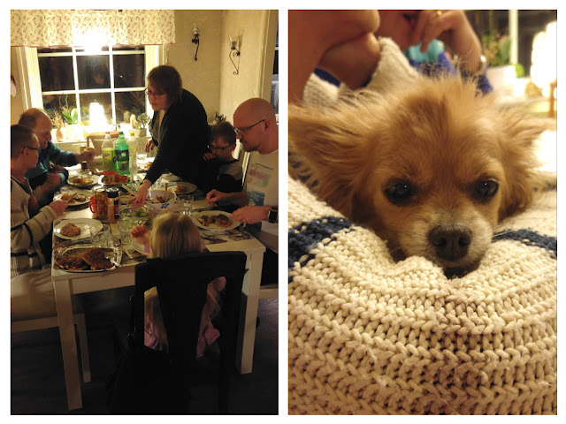 Söndag blev en lugn och seg dag förstås. Tiril hade feber under dagen. Inte på kvällen dock, vi hade bokat middag med mamma och pappa (första gången vi träffar dem riktigt också sen mamma kom hem!!). Jättegod mat som alltid.