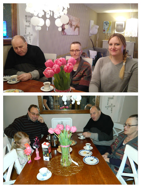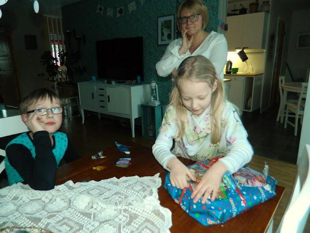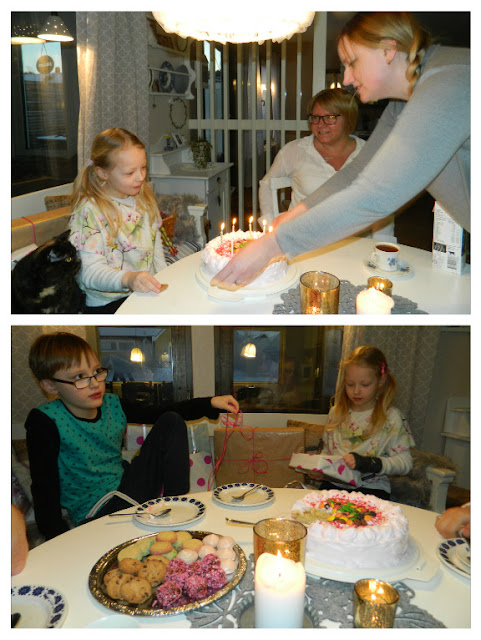 Jag städade lite medan de var i skolan. När jag hämtat barnen kom Christina som första gäst, äntligen fick Tiril öppna mer paket med superfin present! ;) Mattias kom strax hem han också så hon kunde öppna paket från oss.