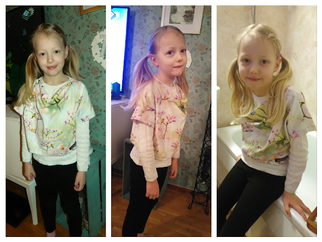 Hon fick som mammasytt födelsedagsplagg en topp med vattenfallsringning att ha över tröja eller linne.