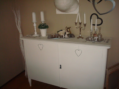 2 av hjärtana vi köpte på Inreda & Sånt blev fina på farmors skänk. Ska köpa fler också för snart är vår "nya" TV-bänk färdigmålad.