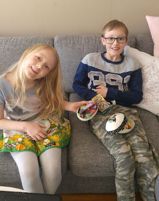 Påskaftonen när jag jobbade kom påskharen ändå på besök, vilken tur! Barnen fick lite godis och varsin present. De hade också fått godisägg av farmor &Voitto och farfar och Lotta, och chokladhare av mormor och morfar så nog fanns godis i mängder...