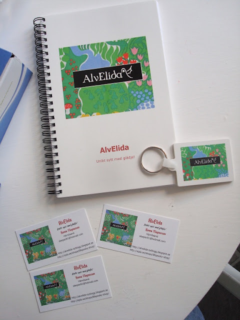 Idag dök mina nya "AlvElida"-prylar upp i brevlådan; en anteckningsbok att skriva upp tillklippta plagg och annat i, en nyckelring och en massa visitkort/tags att sätta på plaggen. =) Allt från Vistaprint, de har ofta erbjudanden på tex. visitkort.