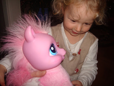 Tiril med en av sina klappar från oss; My Little Pony som kryper och pratar!