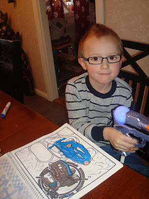 Kiron med 2 av sina julklappar, "Magisk" målarbok med pennor till, och sin space-gun.