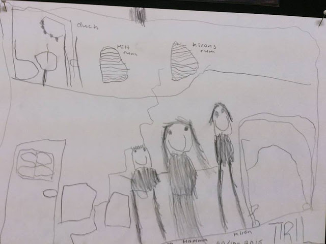 Tiril har ritat en teckning av sin familj och sitt hus, på förskolan. Mattias till vänster, mitten jag och sen Kiron till höger.