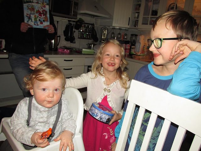 Idag åkte vi iallafall till Bollsta och plockade upp barnen, som hade ritat fina teckningar till både M, morfar och farfar. Mattias fick öppna sina paket!