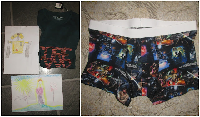 En T-shirt och ett par kallingar, kalsongerna hade jag sytt. Han har önskat sig i just detta tyg och barnen fick beställa med en kram som betalning. ;)