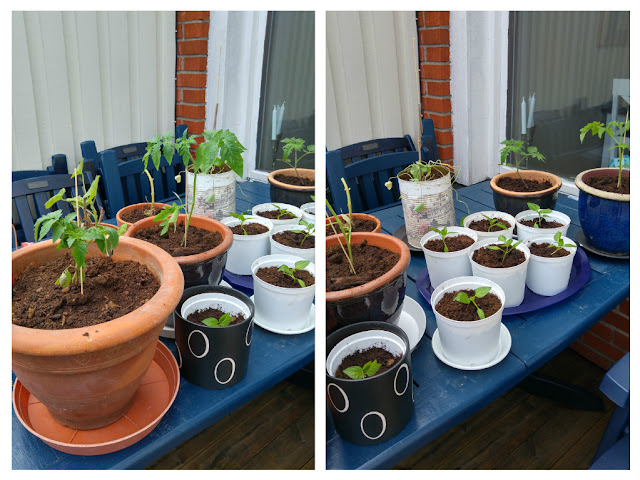 Börjat vänja tomater, paprikor, pelargoner m.m. vid utelivet. Ett jäkla kånkande på krukor varje dag!
